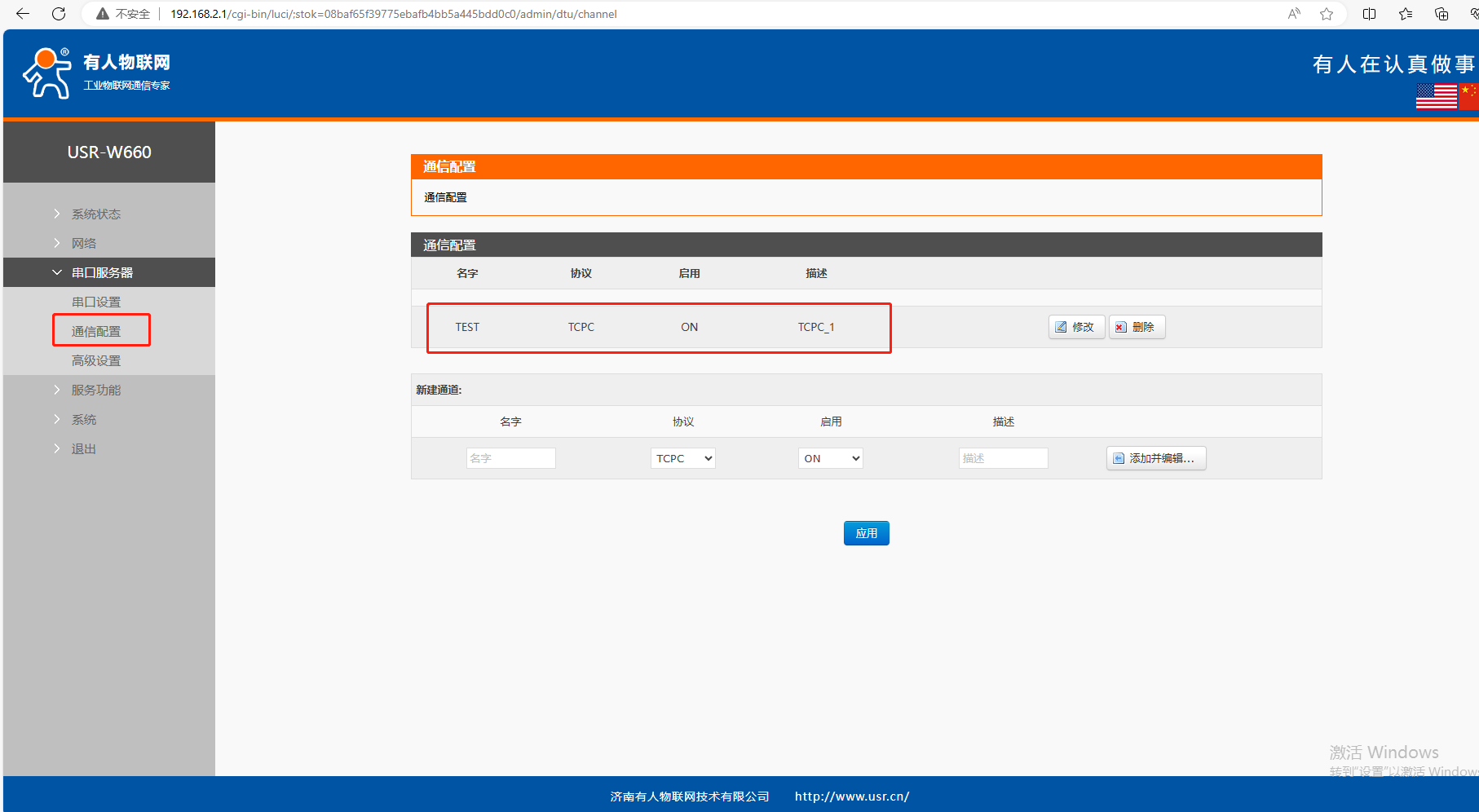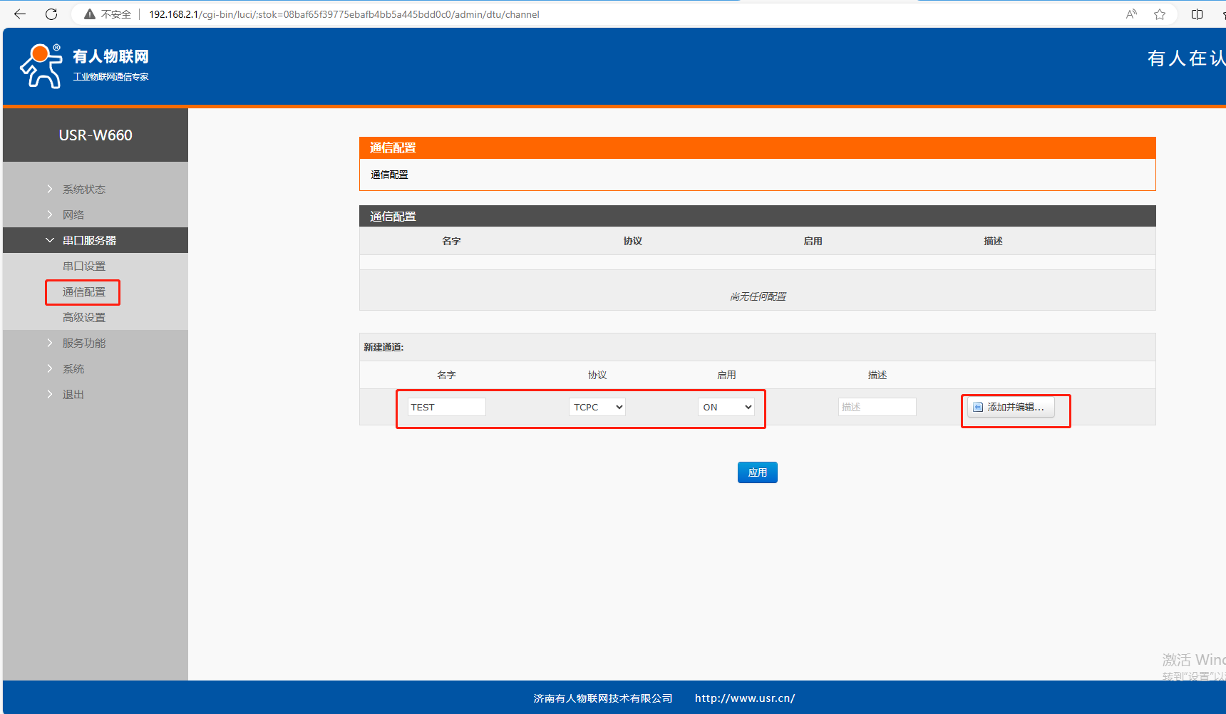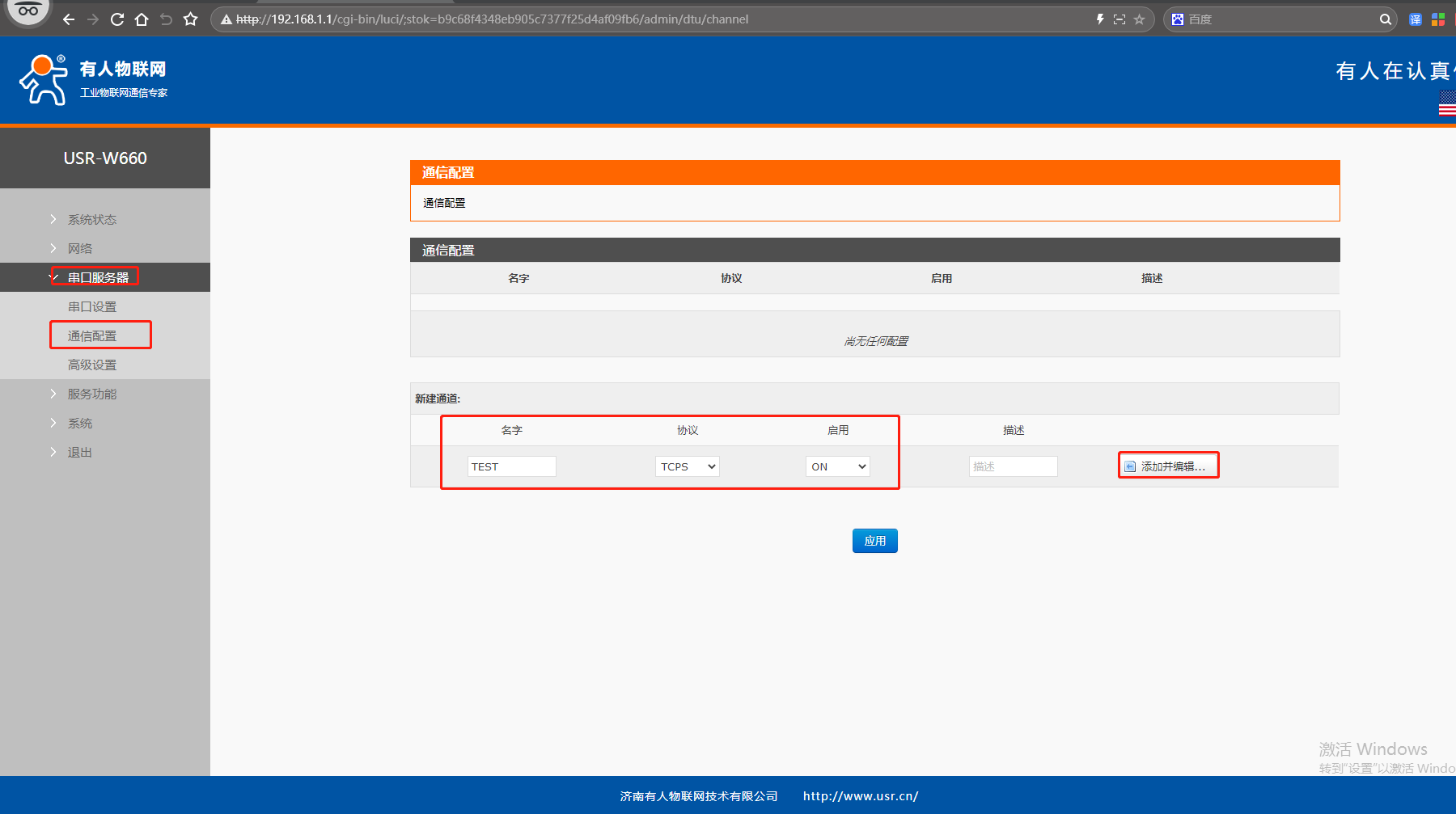 (1)網(wǎng)頁點(diǎn)開串口服務(wù)器,點(diǎn)擊通信配置,USR-W660 AP模式,做TCP server服務(wù)器,網(wǎng)頁新建通道,名字TEST,協(xié)議TCPS,啟用ON,點(diǎn)擊添加并編輯。
