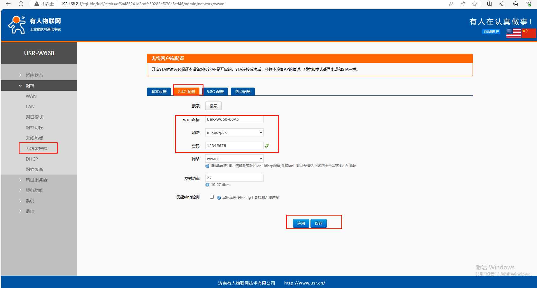 點(diǎn)擊2.4G配置,WiFi名稱填要連接的AP WiFi名,USR-W660-60A5,加密選擇mixed-psk,密碼設(shè)置12345678。點(diǎn)擊應(yīng)用、保存。