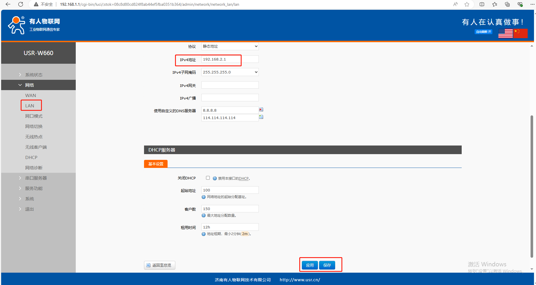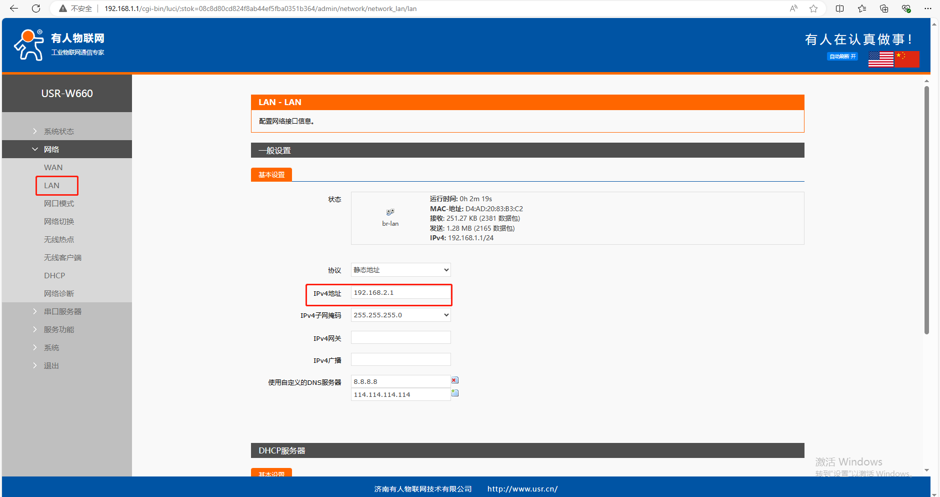 網(wǎng)頁點(diǎn)開網(wǎng)絡(luò),點(diǎn)擊LAN,點(diǎn)擊修改,LAN口的基本設(shè)置,USR-W660做STA模式,IP不要和AP的USR-W660設(shè)置同網(wǎng)段,所以將IP改為其他網(wǎng)段IP 192.168.2.1。