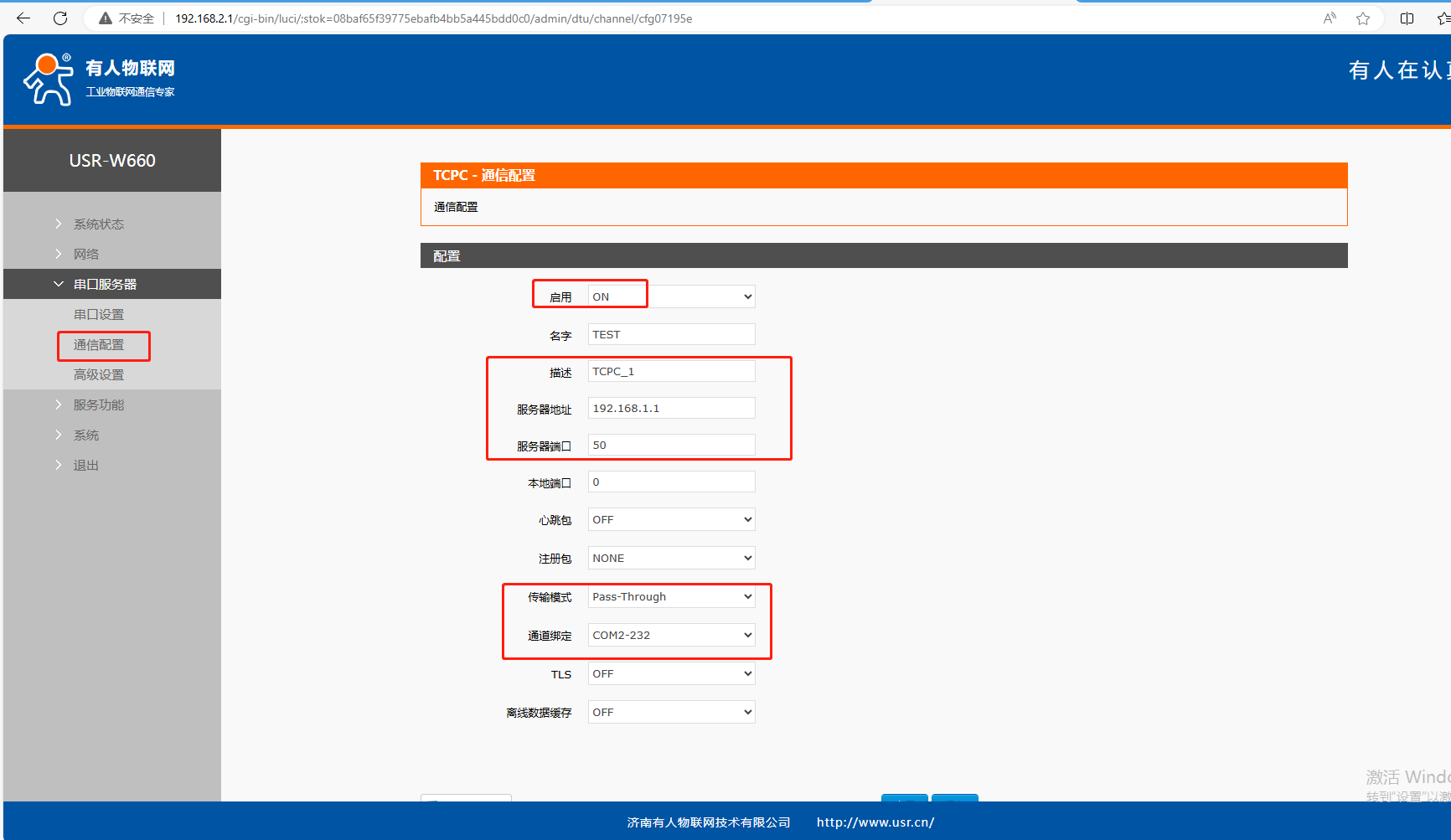 (2)服務(wù)器地址填A(yù)P的USR-W660的IP 192.168.1.1,服務(wù)器端口設(shè)置50,傳輸模式選擇Pass-Through,通道綁定選擇COM2-232。點(diǎn)擊應(yīng)用、保存。
