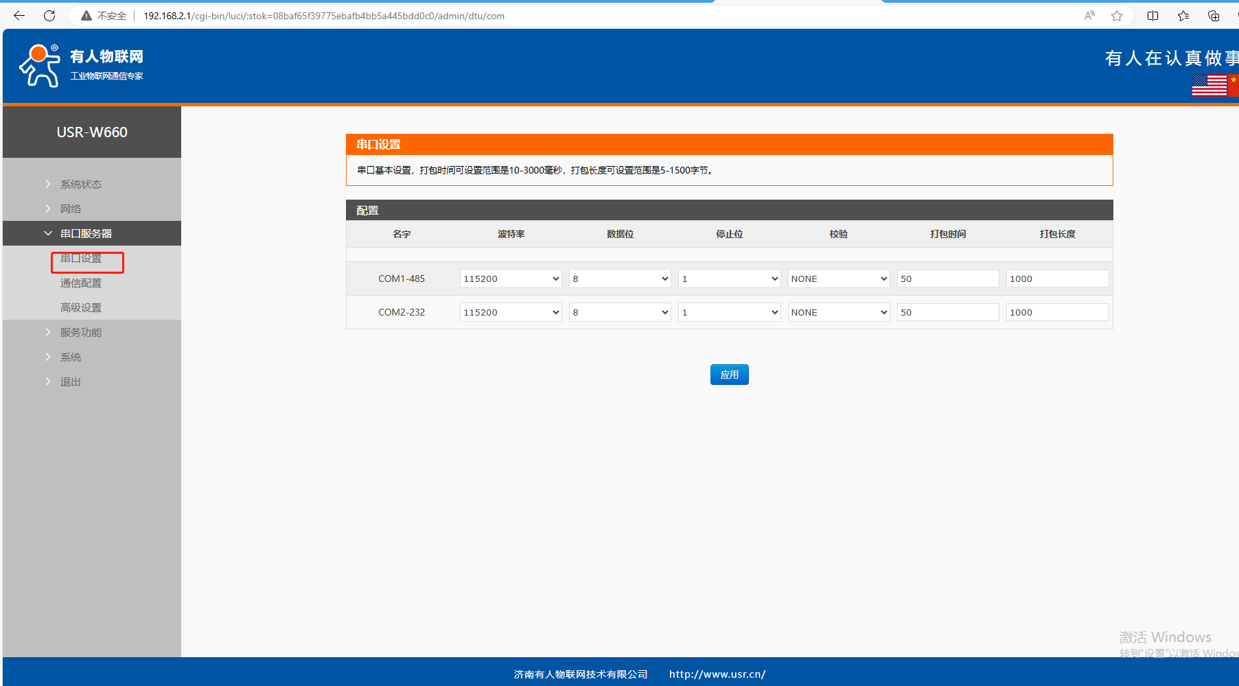 網(wǎng)頁點(diǎn)開串口服務(wù)器,點(diǎn)擊串口設(shè)置,這里可以對USR-W660的485或者232串口參數(shù)進(jìn)行修改設(shè)置。本案例使用默認(rèn)波特率115200。