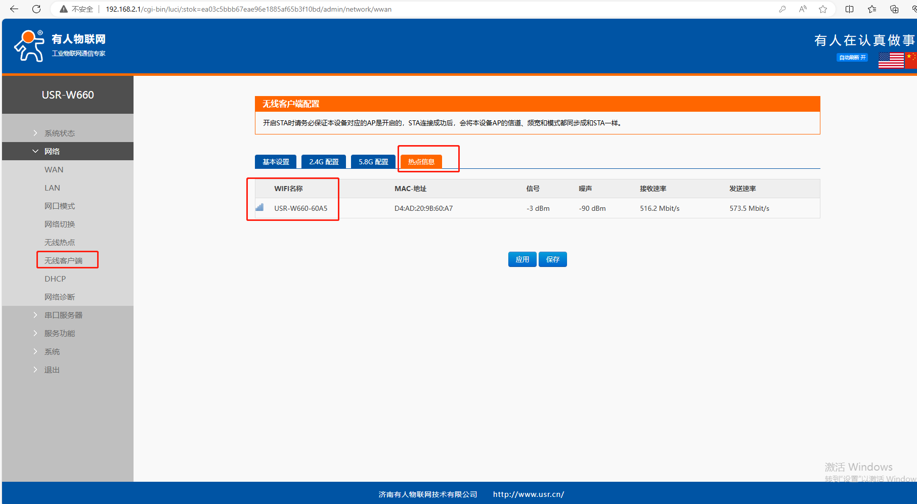 連接2號USR-W660的WiFi,瀏覽器輸入192.168.2.1,登陸網(wǎng)頁,點(diǎn)開網(wǎng)絡(luò),點(diǎn)擊無線客戶端,點(diǎn)擊熱點(diǎn)信息,可以查看連上AP的信息。