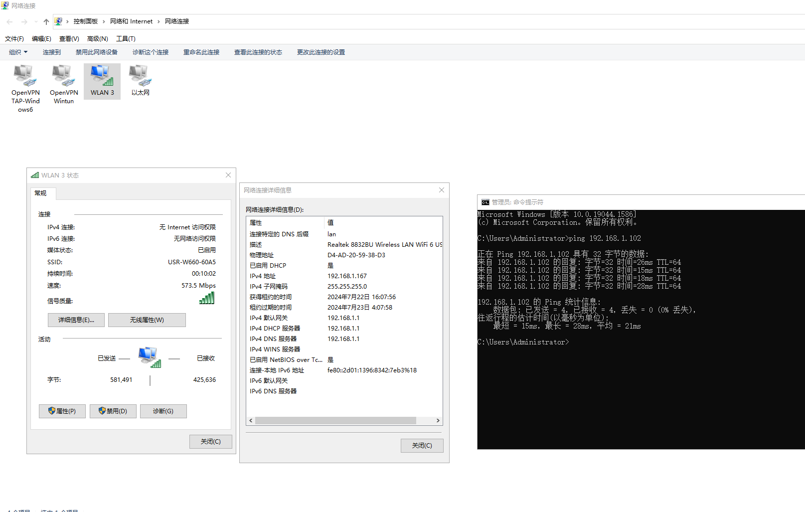 第一臺電腦無線連接1號USR-W660(AP模式)的WIFI,電腦有線網(wǎng)卡查看IP 是192.168.1.167。