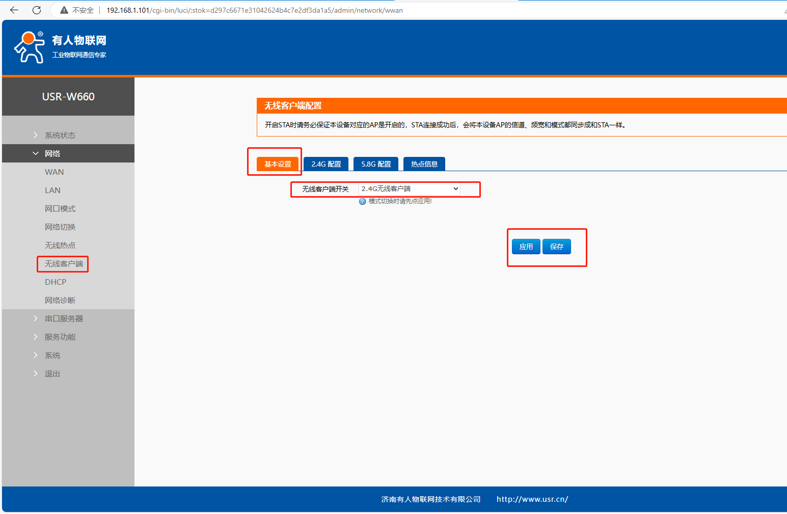 網(wǎng)頁點開網(wǎng)絡(luò),點擊無線客戶端,點擊基本設(shè)置,無線客戶端開關(guān),選擇2.4G無線客戶端,點擊應(yīng)用、保存。