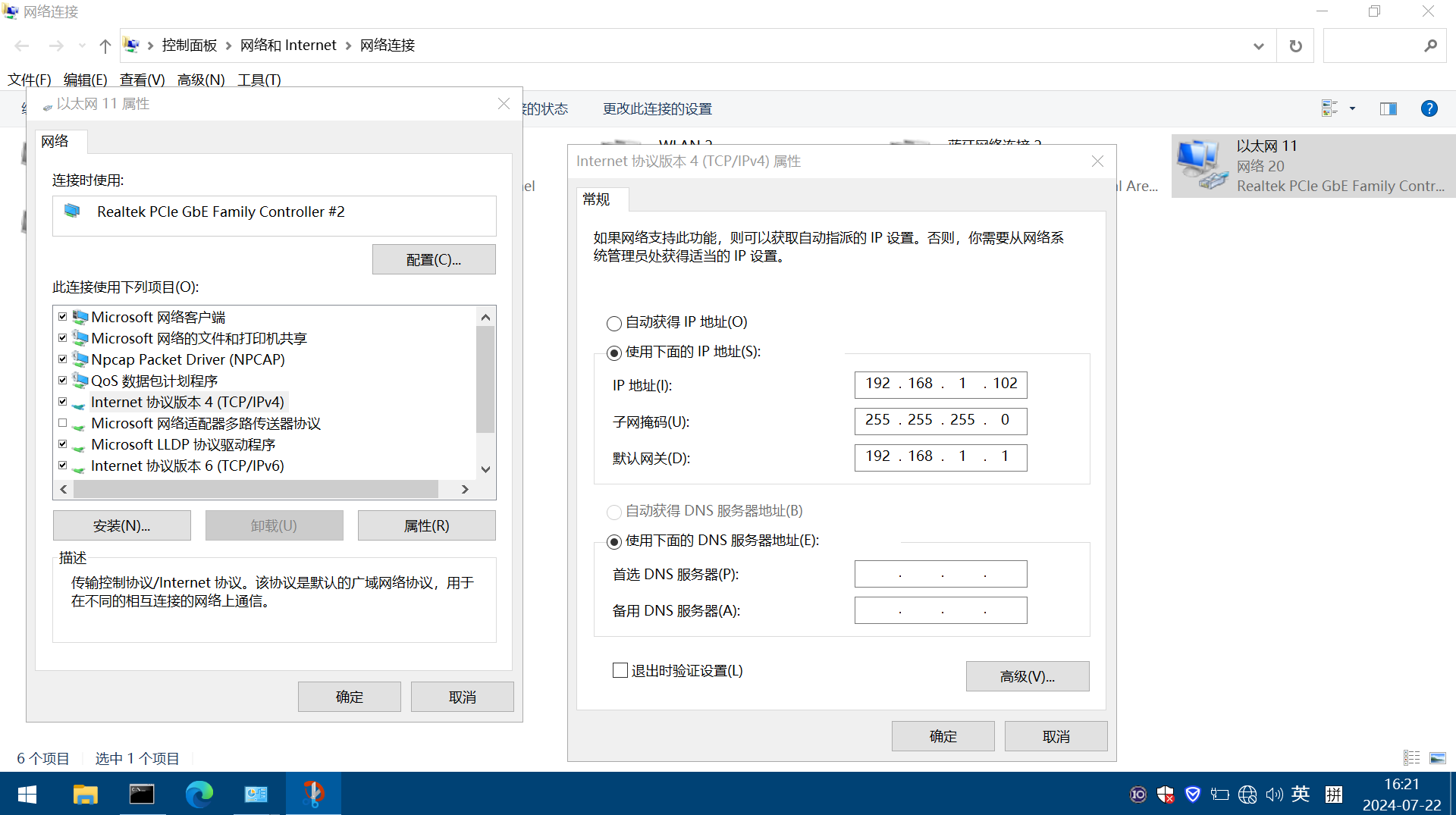 (1)第二臺電腦有線連接第2個USR-W660(STA模式橋接模式) 的LAN口,電腦有線網(wǎng)卡設(shè)置和AP同網(wǎng)段的靜態(tài)IP 192.168.1.102。