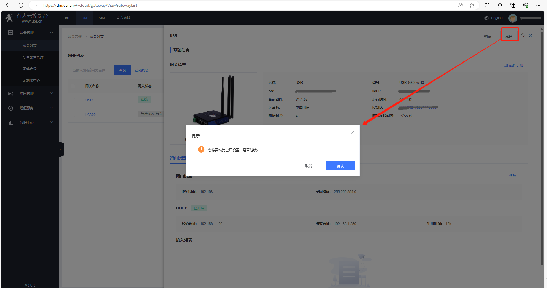 5、DM平臺,點擊更多,恢復(fù)出廠值