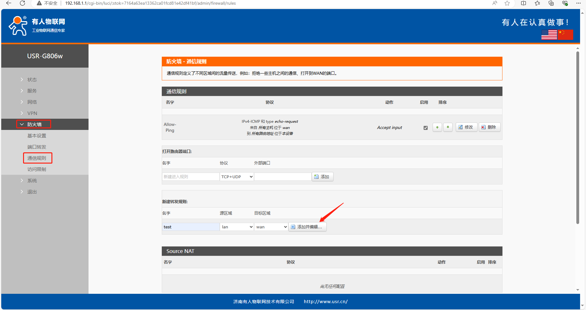 (1)手機(jī)連接USR-G806w的WiFi,網(wǎng)頁點(diǎn)擊防火墻,點(diǎn)擊通信規(guī)則,首先在新建轉(zhuǎn)發(fā)規(guī)則中輸入規(guī)則的名字,然后點(diǎn)擊“添加并編輯”按鈕,如下圖: