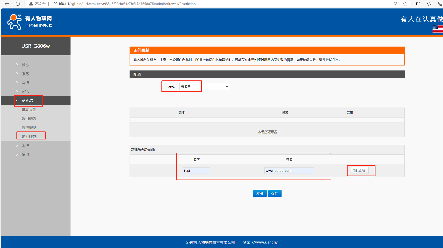 備注:如果選擇黑名單,而未添加規(guī)則,默認黑名單為空,即所有域名都可以訪問。