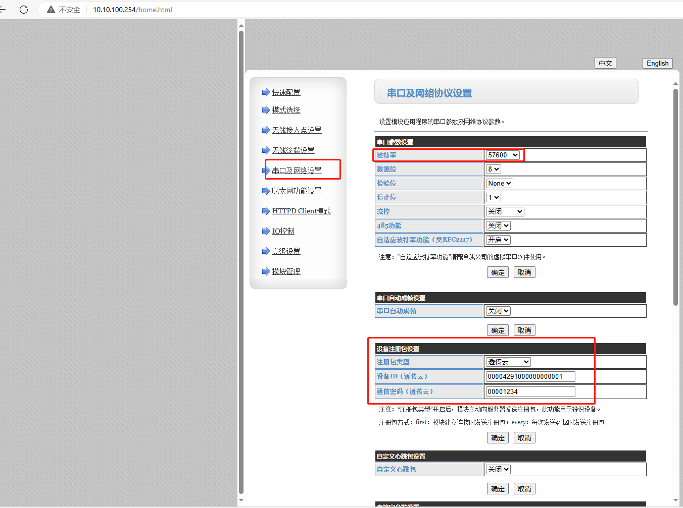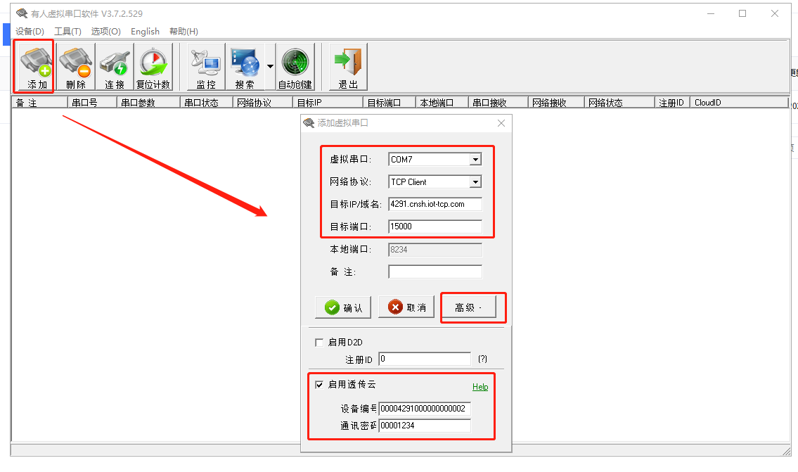 高級設置開啟透傳云,輸入有人云添加設備的編號ID 00004291000000000002和密碼00001234,點擊確認。
