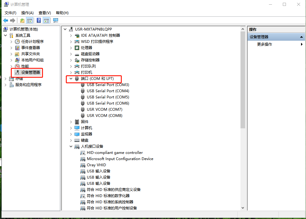 電腦鼠標點擊計算機管理,右擊,點開設備管理器,點擊端口,查看接USR的USB-RS232串口線COM口號。