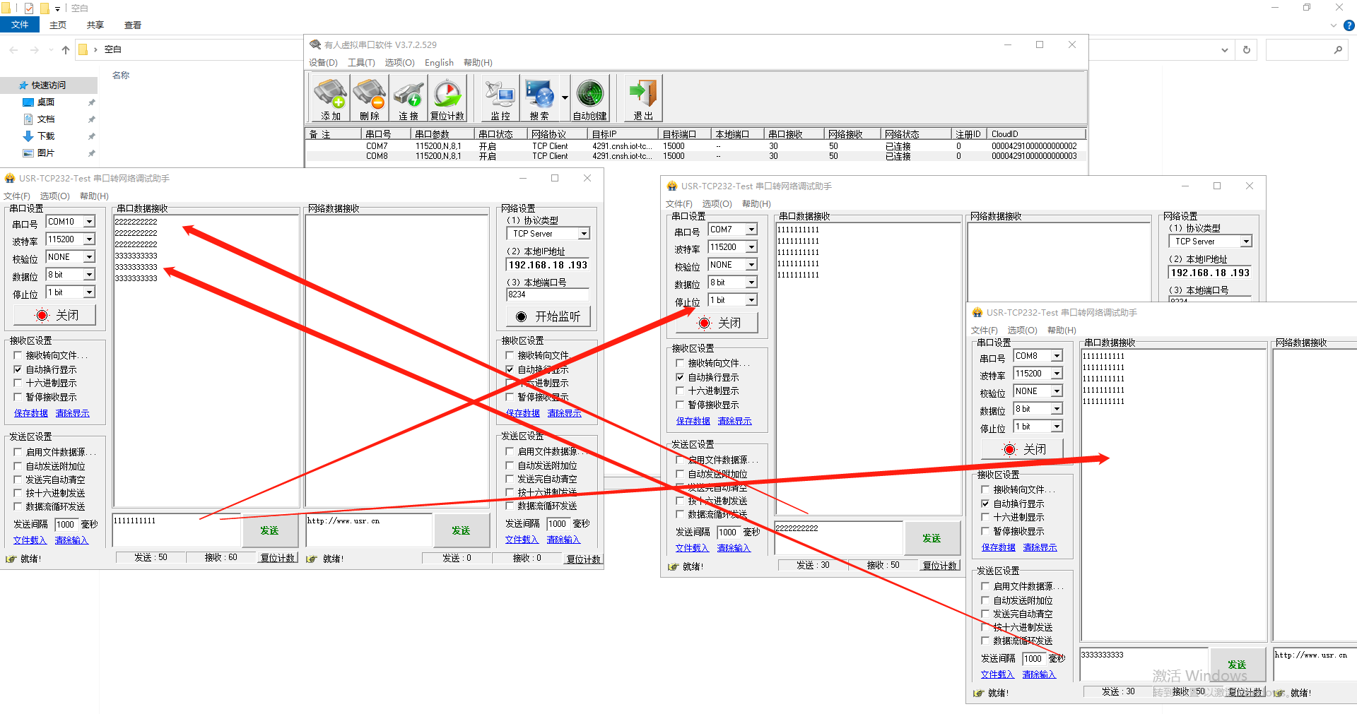打開3個串口助手,分別用有人產(chǎn)品實際USB串口COM10打開串口,另外2個串口助手用虛擬串口COM7、COM8打開串口。