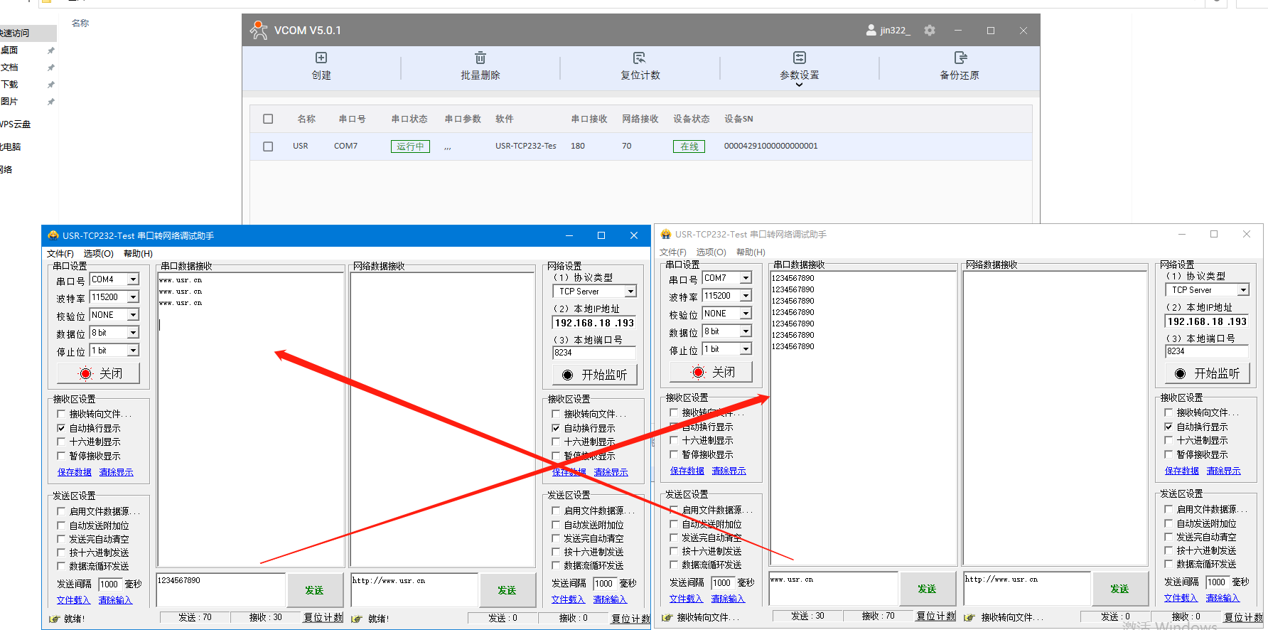 USR-K7上云和虛擬串口軟件(V5版本)一對(duì)一通訊示例