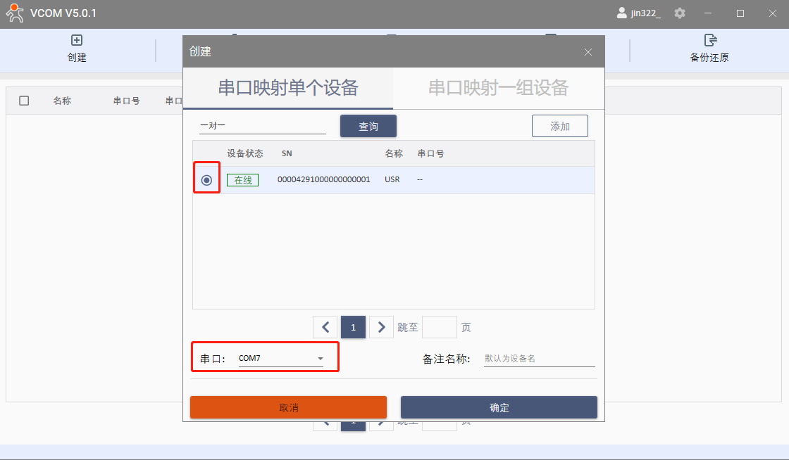 選擇串口映射單個(gè)設(shè)備,勾選在線的USR-K7,用空閑的COM7作為虛擬串口的COM口號(hào),點(diǎn)擊確定。