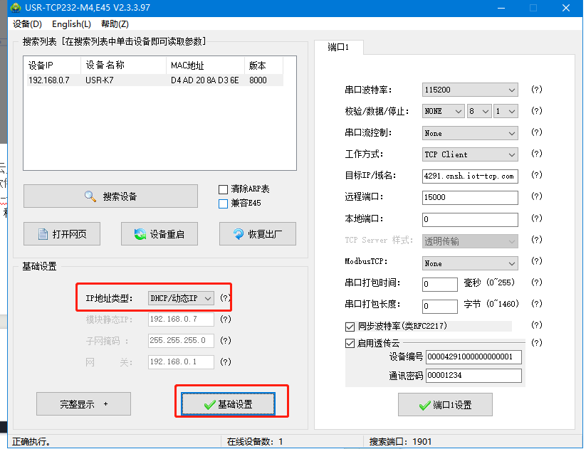 4、重新搜索USR-K7的IP,基礎(chǔ)設(shè)置,IP地址類型,將靜態(tài)IP改為DHCP,點(diǎn)擊基礎(chǔ)設(shè)置。設(shè)置完DHCP之后,USR-K7網(wǎng)線接可以上外網(wǎng)的路由器LAN口。