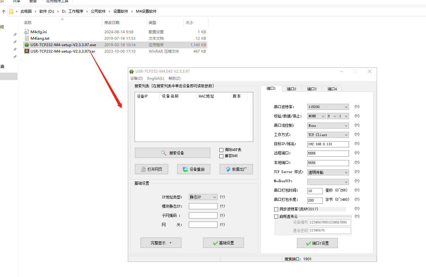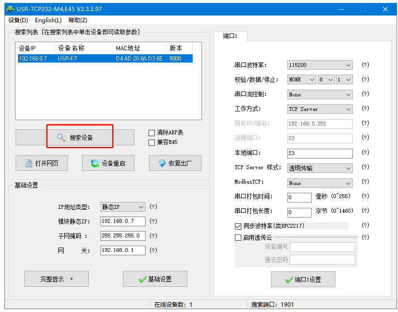 2、用M4設(shè)置軟件,點(diǎn)擊搜索,搜到USR-K7的IP。