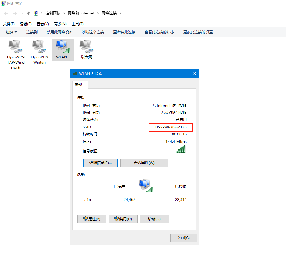 (1)連接USR-W630s 2.4GHZ WiFi,USR-W630s-232B