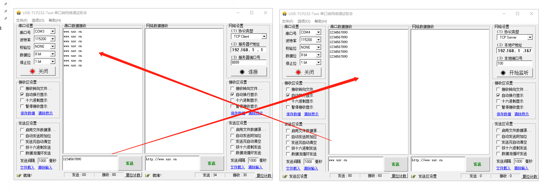 1、打開2個串口助手,串口參數(shù)設(shè)置和2個USR-W630s 232串口參數(shù)一致。115200,NONE,8,1
