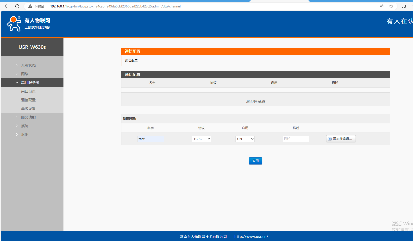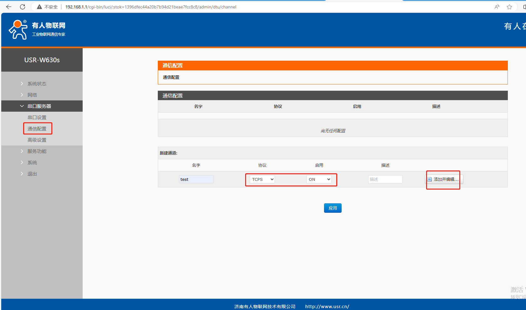 (5)串口服務(wù)器,通信配置,協(xié)議TCPS,應用ON,點擊添加并編輯。