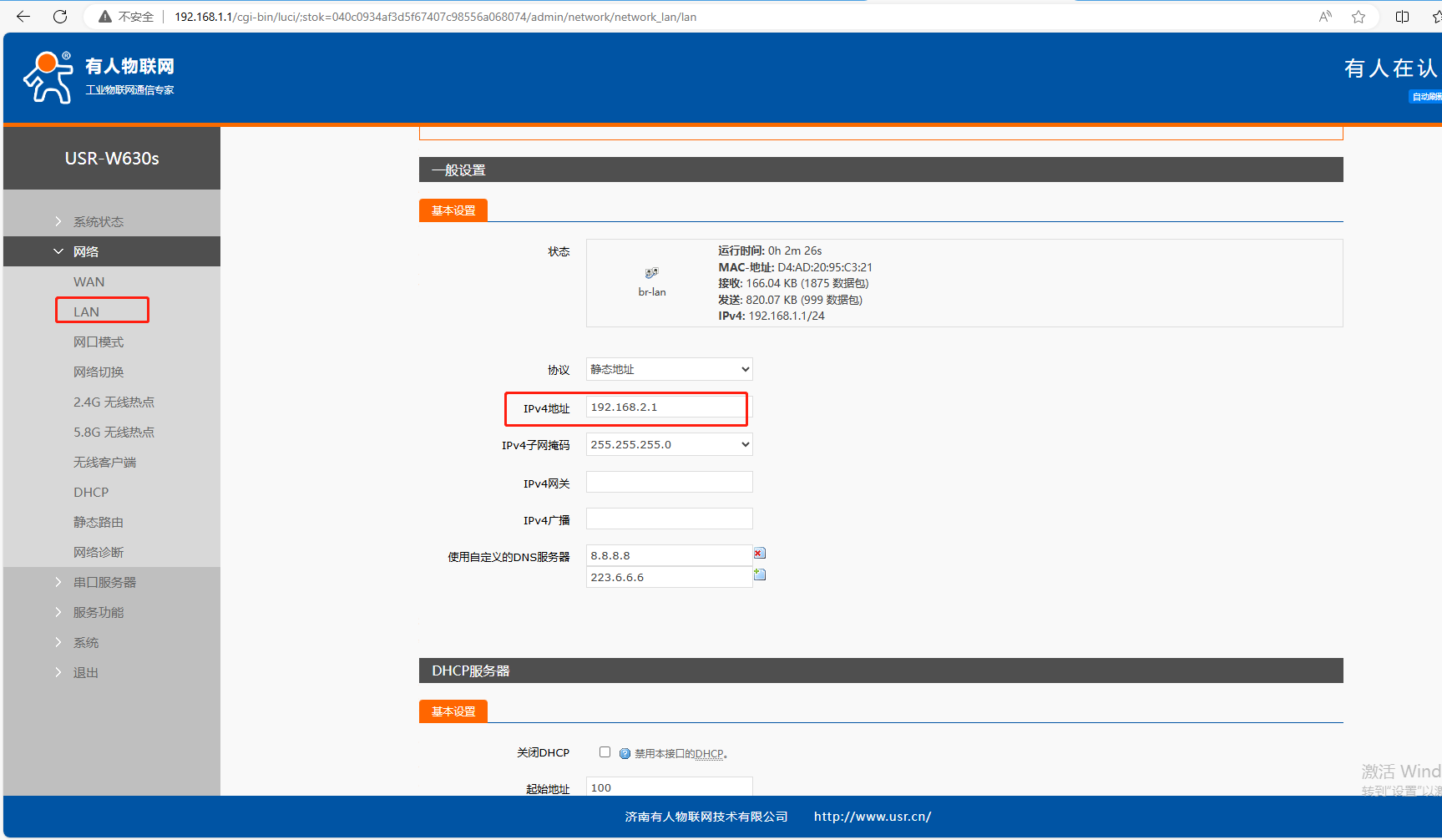 (6)網(wǎng)絡(luò),LAN,點擊修改,IPv4地址192.168.1.1,要改為和做AP的USR-W630s不一樣的網(wǎng)段IP。這里改為192.168.2.1,點擊應用。