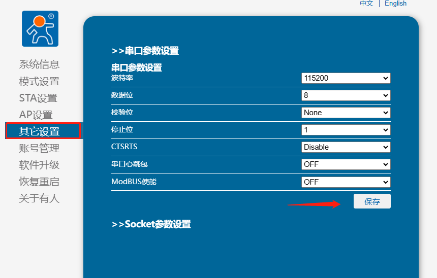 在“模式設(shè)置”設(shè)備保持AP模式,在“其他設(shè)置”界面,可以配置設(shè)備串口參數(shù)與實(shí)際要接串口設(shè)備的串口參數(shù)一致,本案例使用115200波特率,NONE無(wú)校驗(yàn)、數(shù)據(jù)位8、停止位1點(diǎn)擊保存,先別重啟,繼續(xù)配置模塊socket參數(shù)。