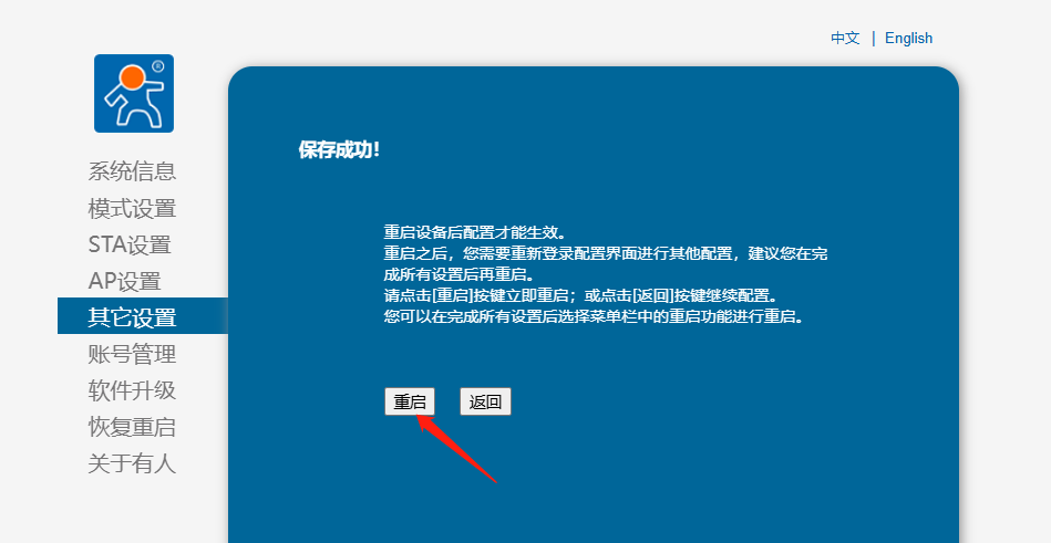 “其他設(shè)置”界面中配置模塊為tcp server模式,端口8899,保存,重啟。