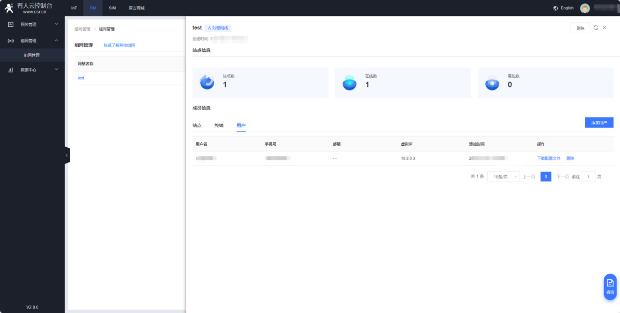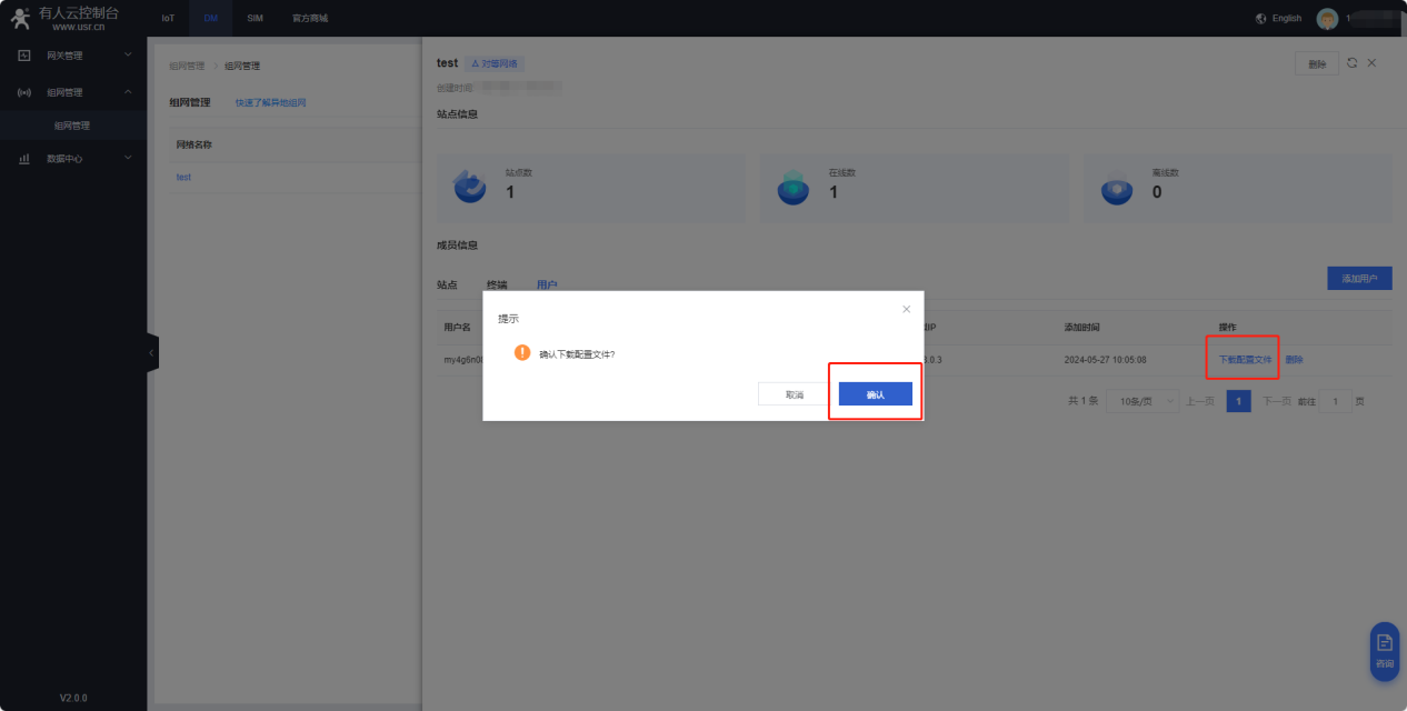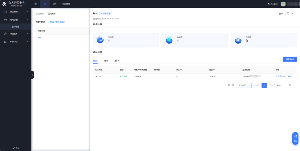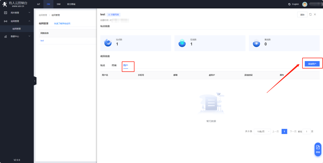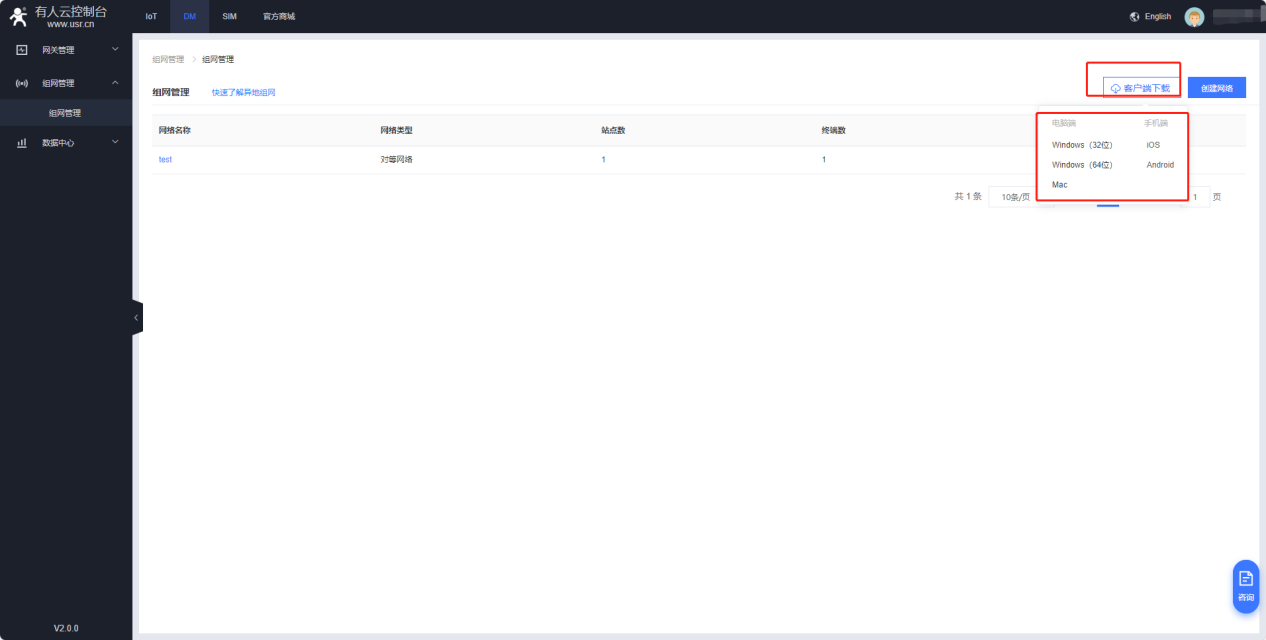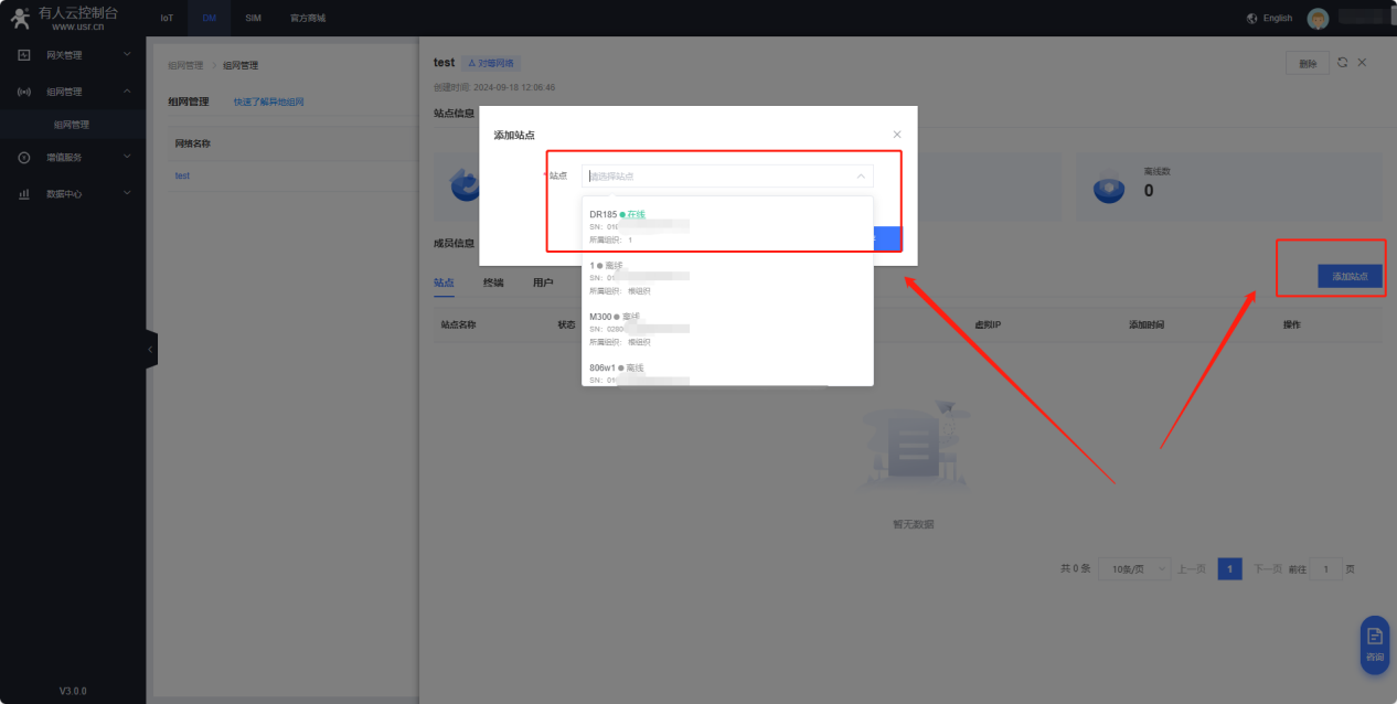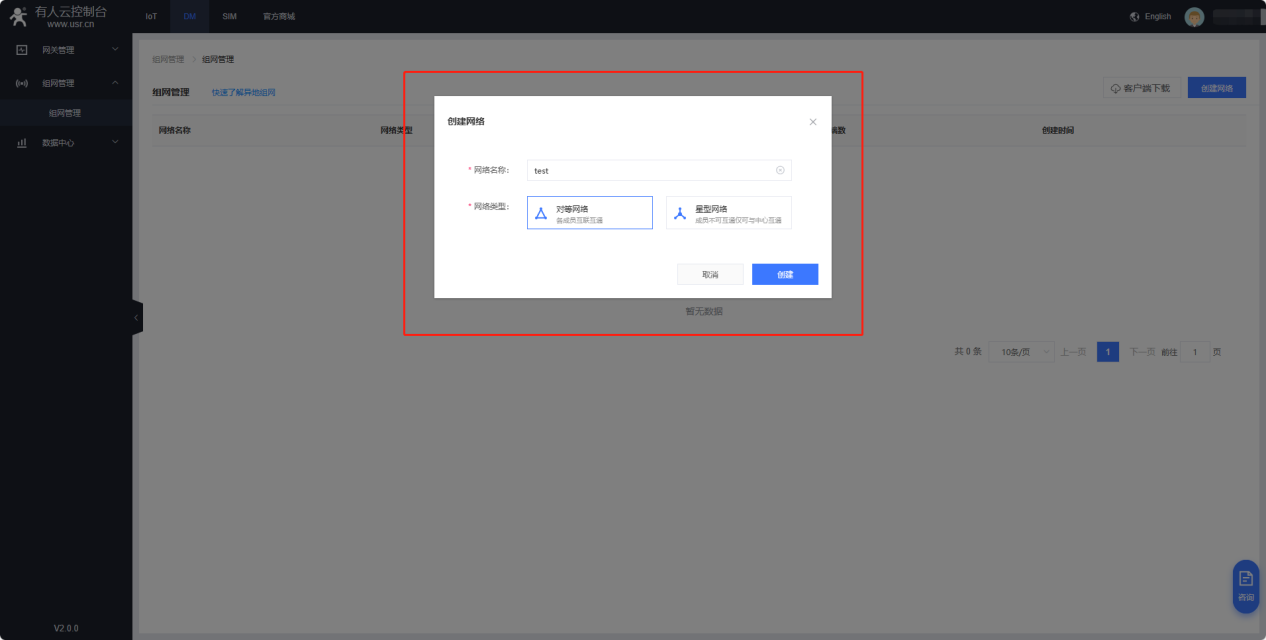 5、登錄電腦版本有人云(cloud.usr.cn),添加DM組網(wǎng),首次使用需要提交申請,提交申請后可立即使用。