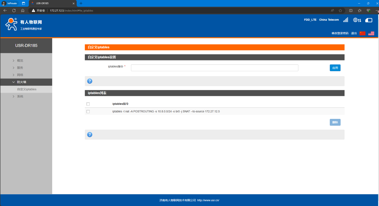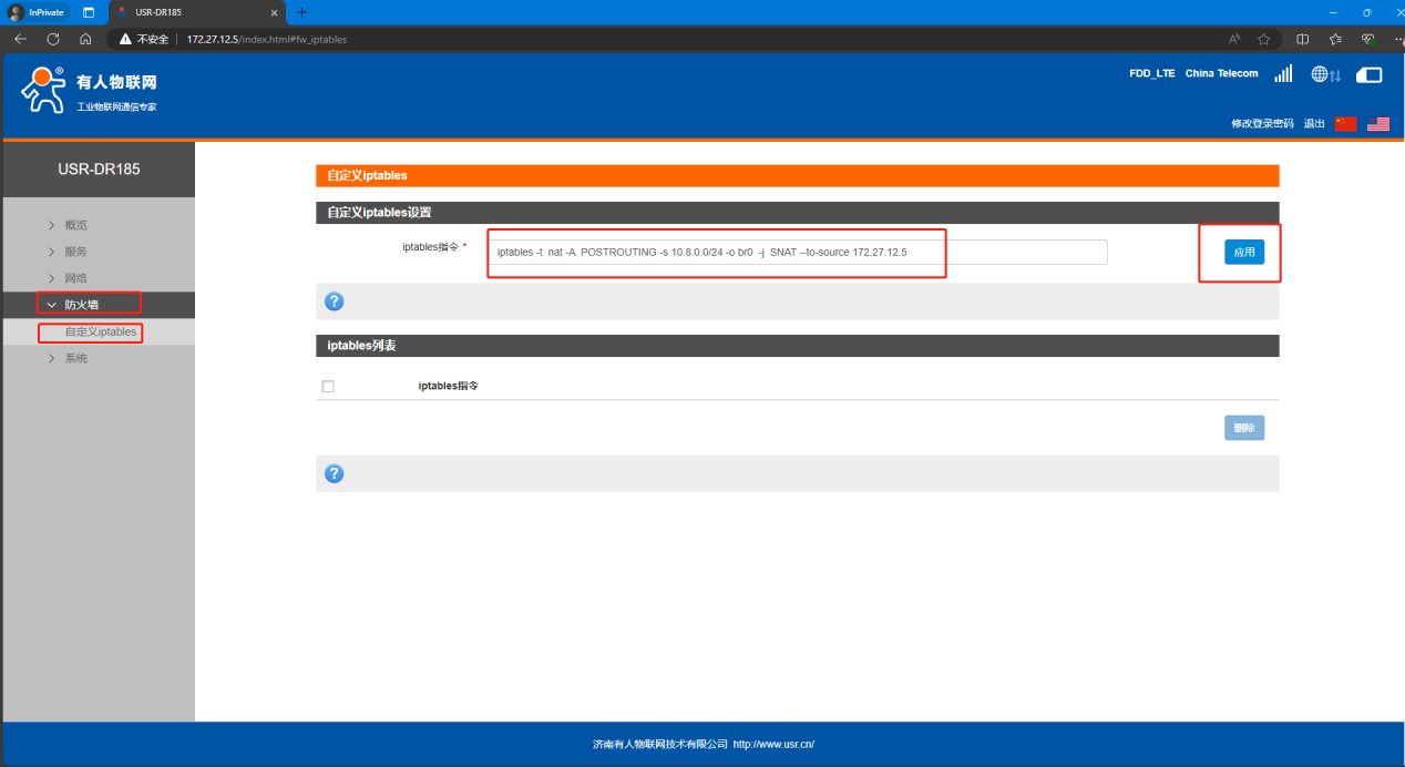 3、在防火墻--自定義iptables里添加SNAT指令。臨時固件支持,常規(guī)固件近期也會上架。