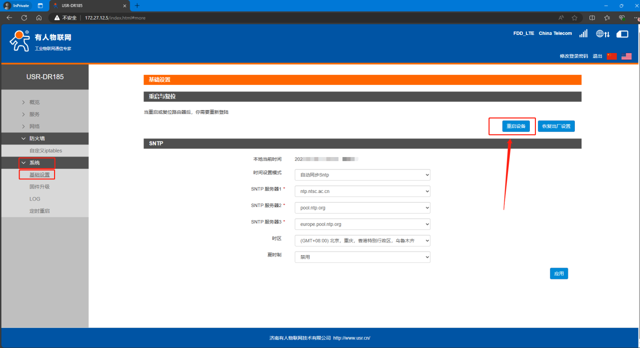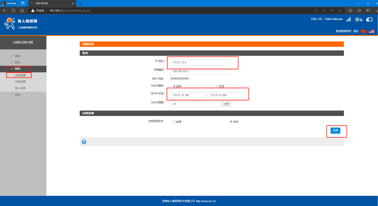 2、修改lan口IP,這里根據(jù)需求設置,無其他要求可以使用默認IP。在網(wǎng)絡--內(nèi)網(wǎng)設置,修改IP地址和DHCP IP池,因為DM組網(wǎng)設置終端時為固定IP,所以終端建議設置為靜態(tài)IP,這里的DHCP服務可以關閉。設置完點擊應用,斷電重啟。