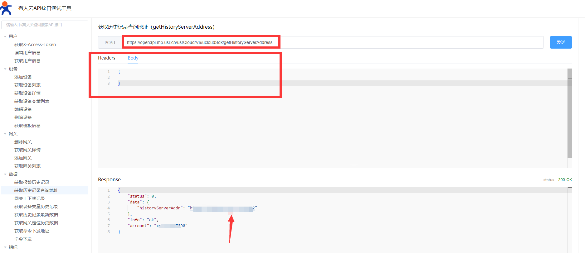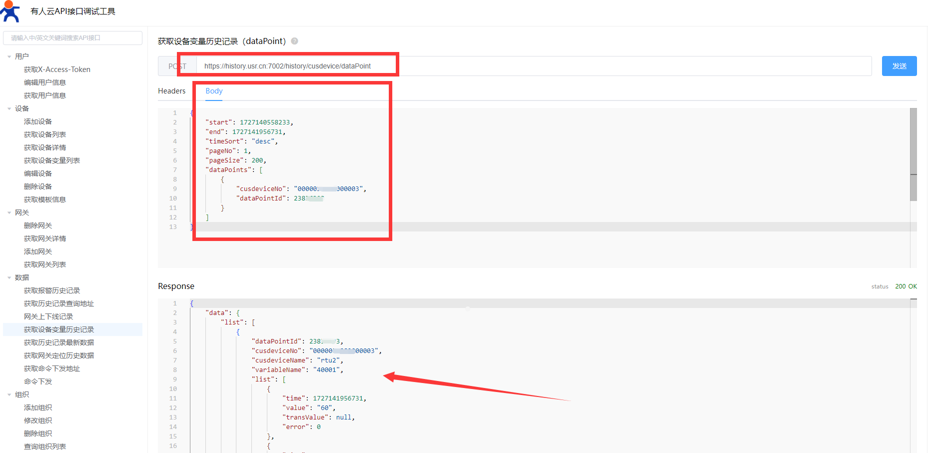 C、將說明文檔中示例粘入body,具體參數(shù)需要替換為自己的實際參數(shù),可在平臺查看,發(fā)送后獲取到查詢時間段內的歷史數(shù)據(jù)(時間戳格式為unix時間戳ms)