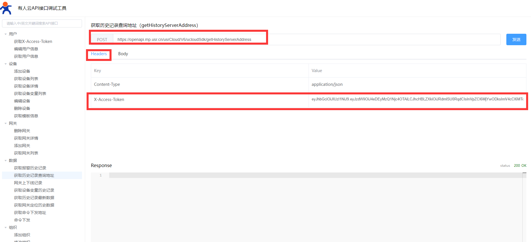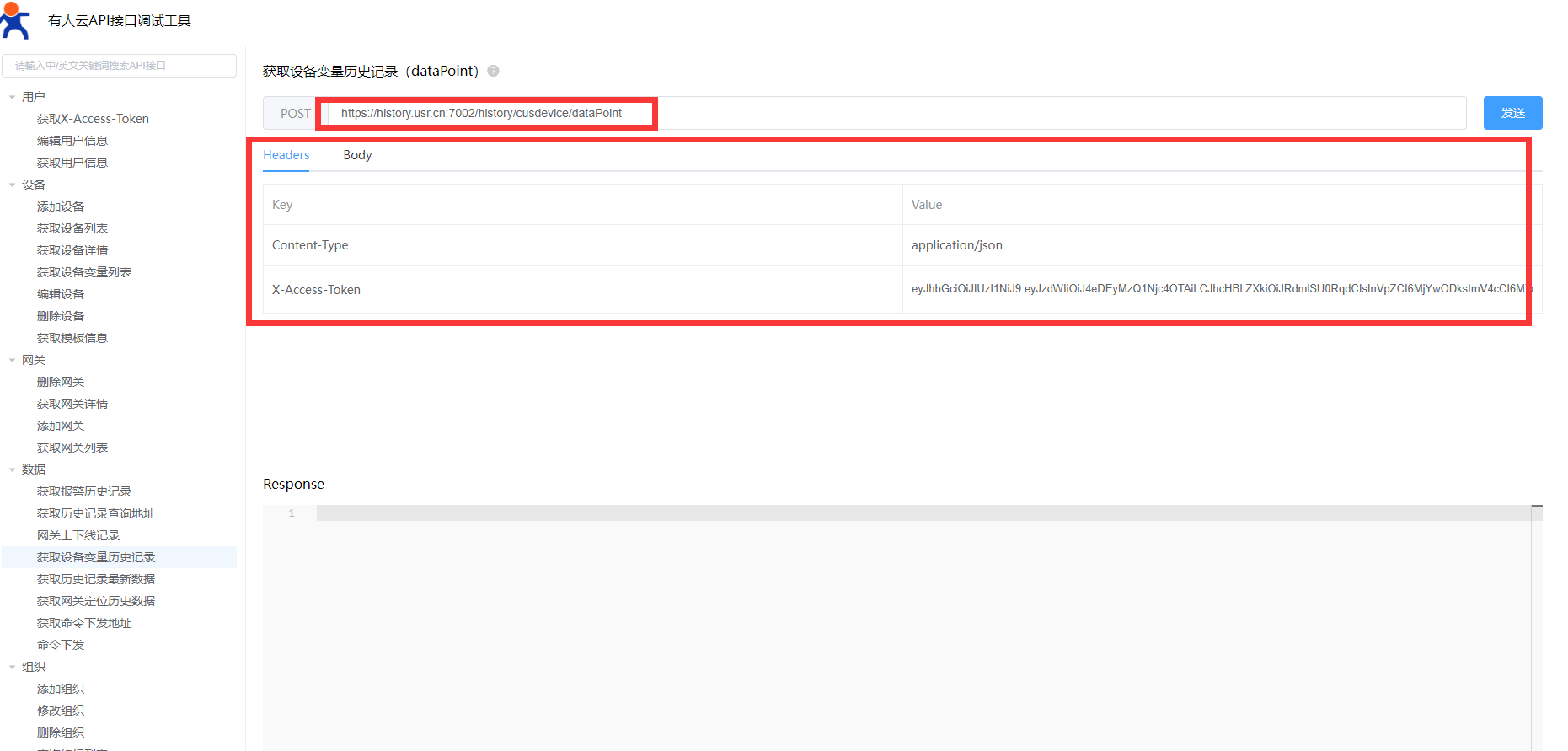 A、將{url}/history/cusdevice/dataPoint中{url}的替換為前一步獲取的查詢地址,組成獲取設備變量歷史記錄的URL:https://history.usr......./history/cusdevice/dataPoint