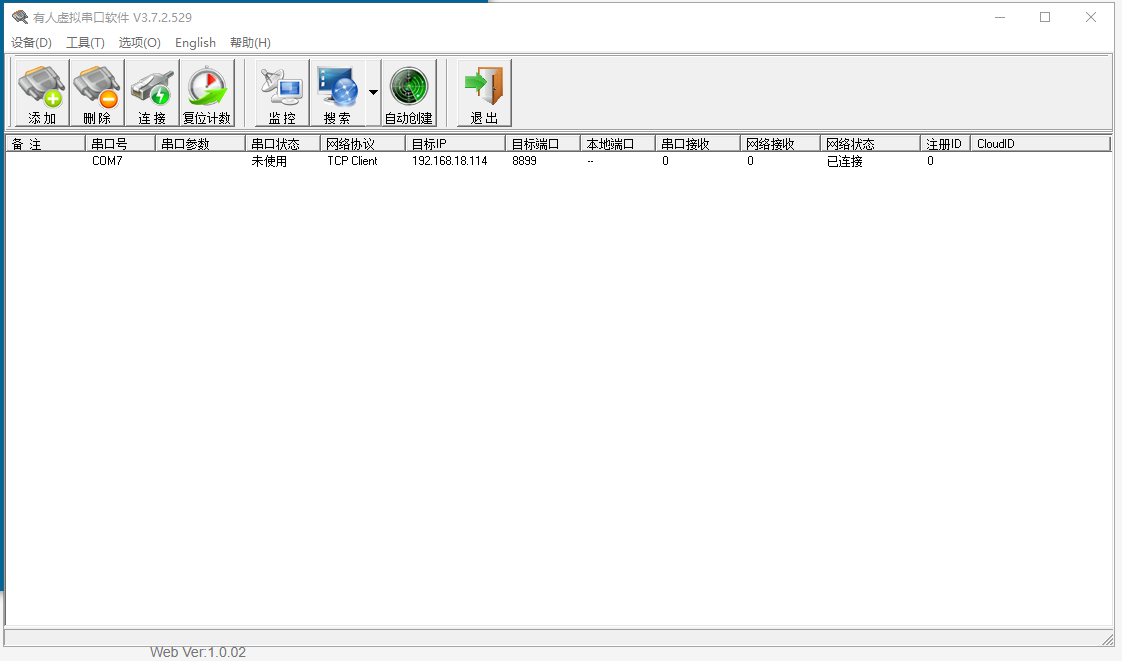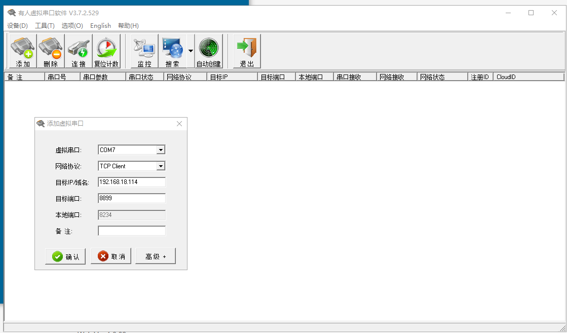 打開虛擬串口軟件,點擊添加,虛擬串口選擇一個不被占用的串口號COM7,網絡協(xié)議TCP Client,目標IP填USR-DR164的IP,192.168.18.114,目標端口8899