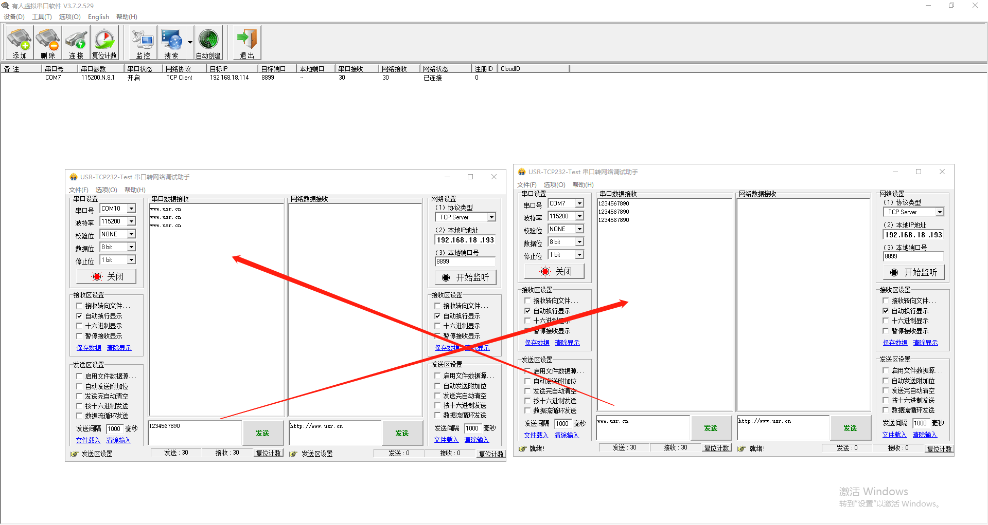 在電腦上打開兩個USR-TCP232-TEST軟件,一個打開USR-DR164對應的COM口,串口參數設置和USR-DR164一致。另一個打開虛擬串口的COM口。