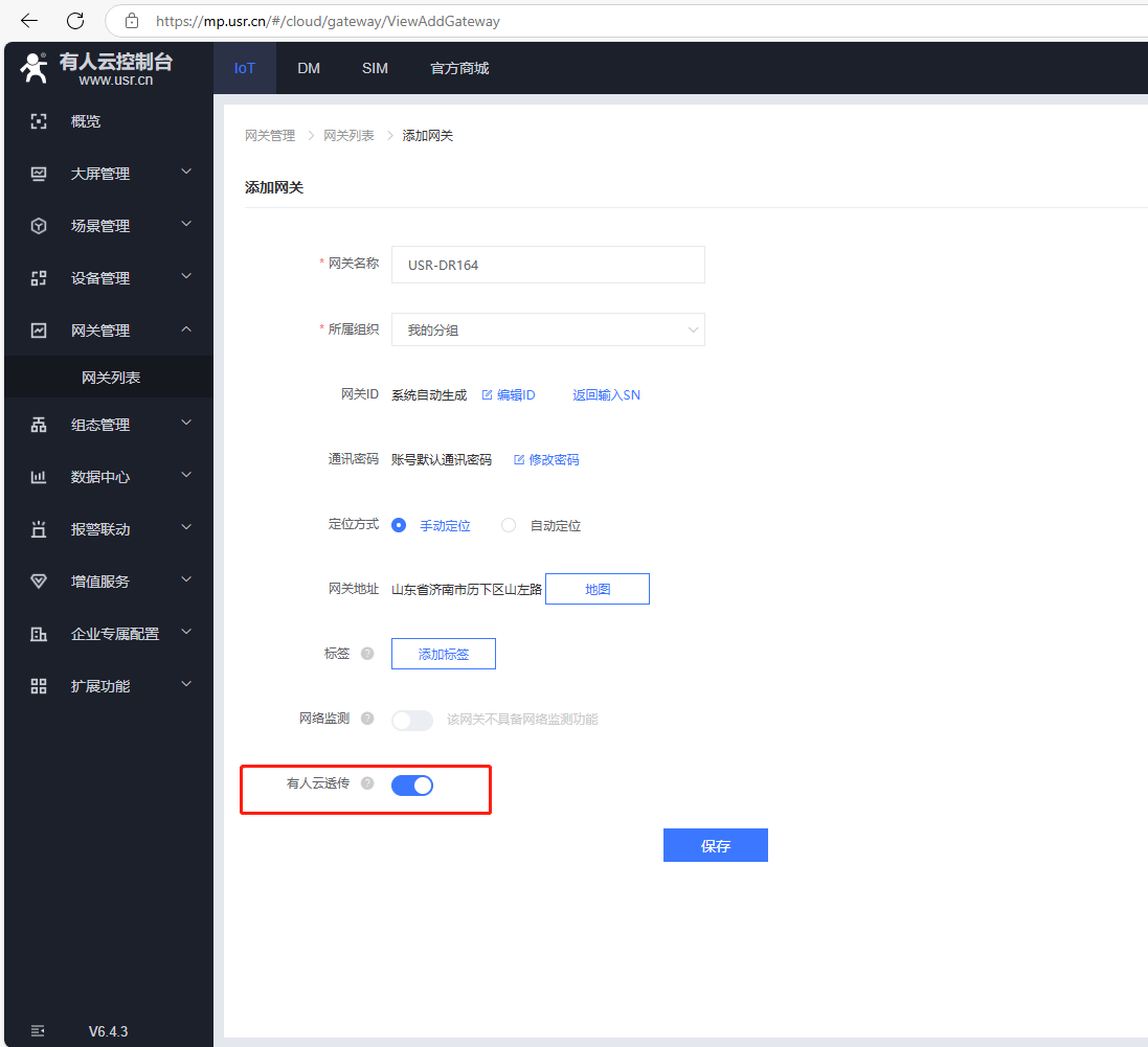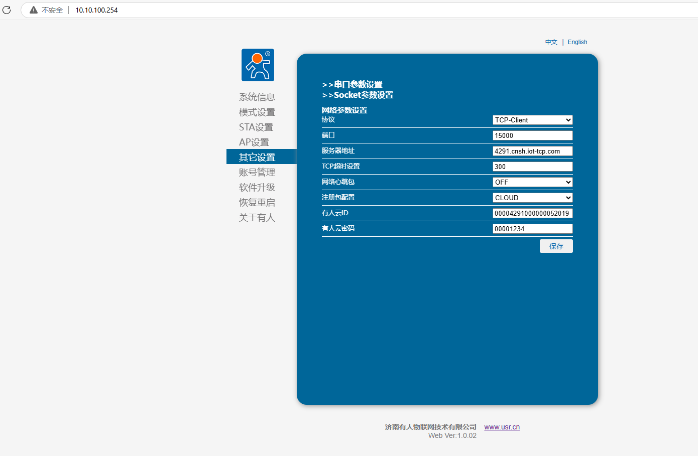 開啟注冊(cè)包,選擇CLOUD,設(shè)備ID填添加有人云的ID 00004291000000052019,通信密碼填00001234,點(diǎn)擊保存。