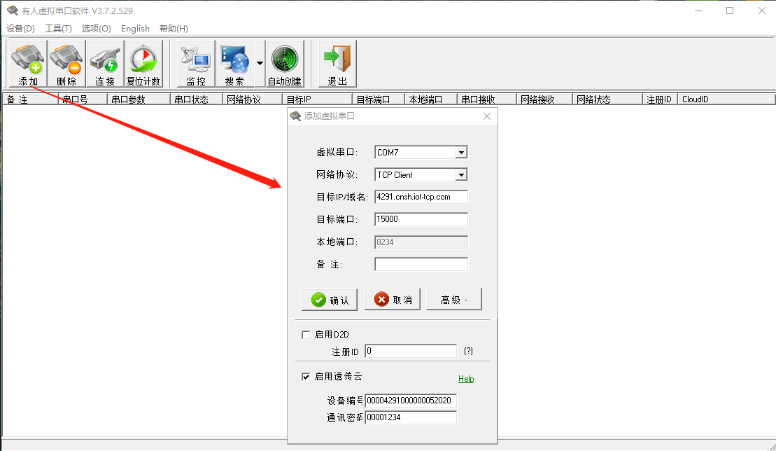 下載虛擬串口軟件,在虛擬串口軟件中把系統(tǒng)分配的SN和通訊密碼進(jìn)行配置。