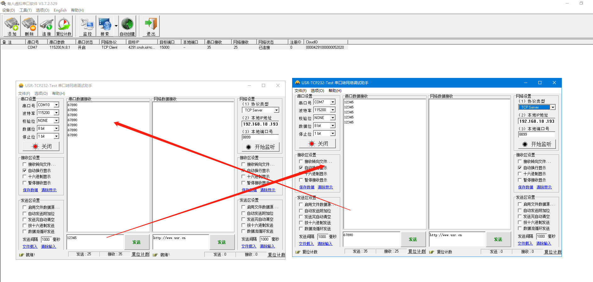 1、打開2個(gè)串口助手,分別用USR-DR164實(shí)際USB串口COM10打開串口,另一個(gè)串口助手用虛擬串口COM7打開串口。