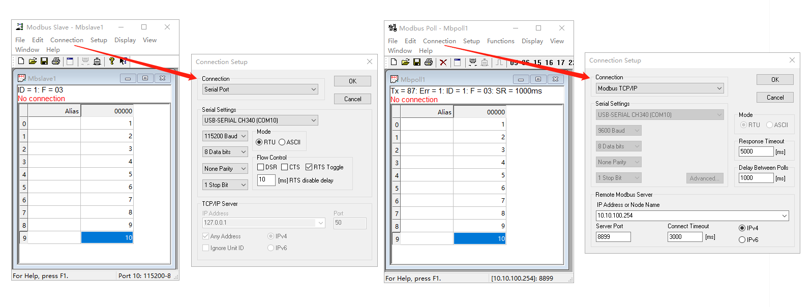 2、打開MODBUS SLAVE和MODBUS POLL軟件,MODBUS SLAVE的Connection選擇串口COM10,串口參數(shù)設(shè)置和DR164一致。MODBUS POLL的Connection選擇Modbus TCP/IP,IP地址填10.10.100.254,端口填8899。