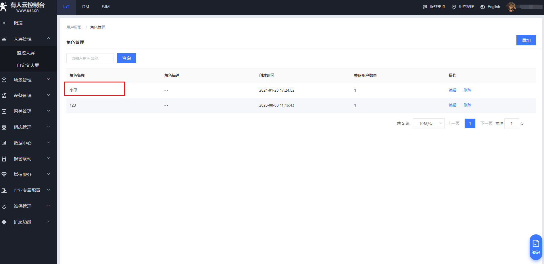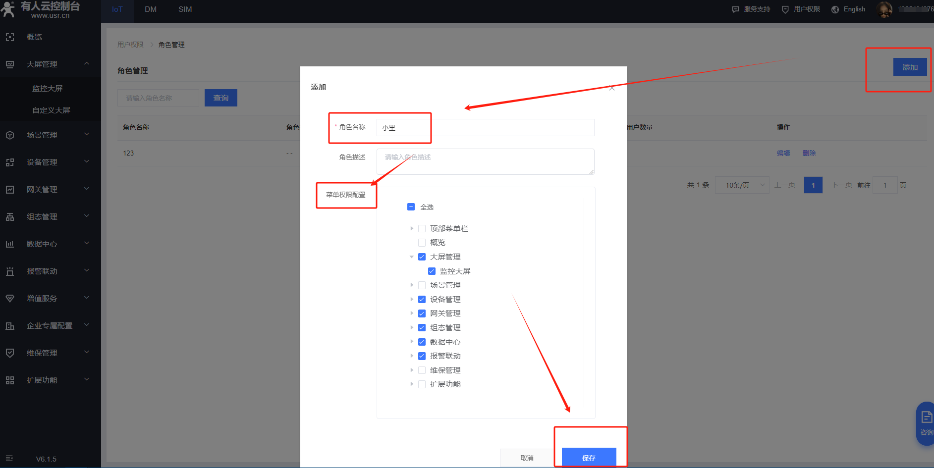 1、首先在用戶權(quán)限——角色管理,添加角色,選擇要給角色分配設(shè)備權(quán)限,保存