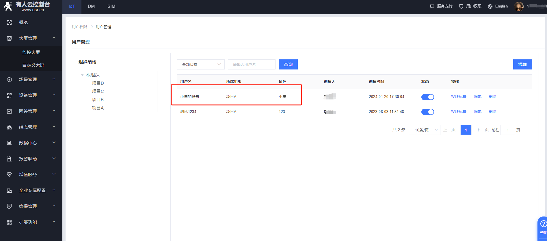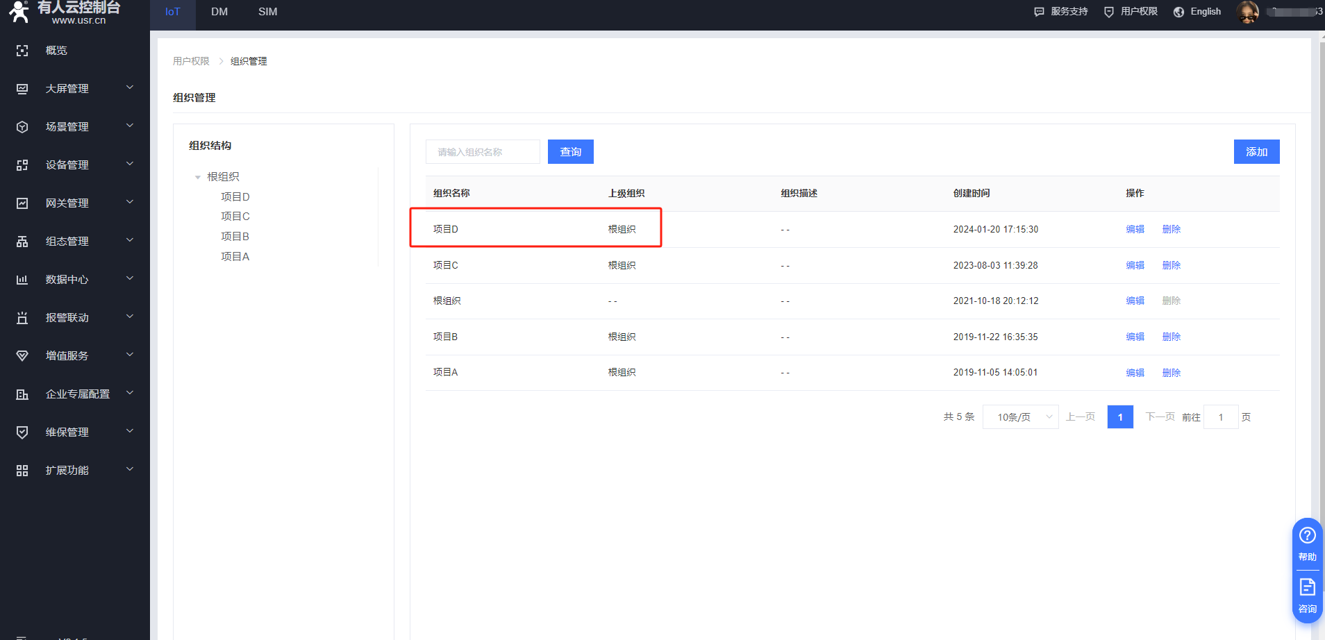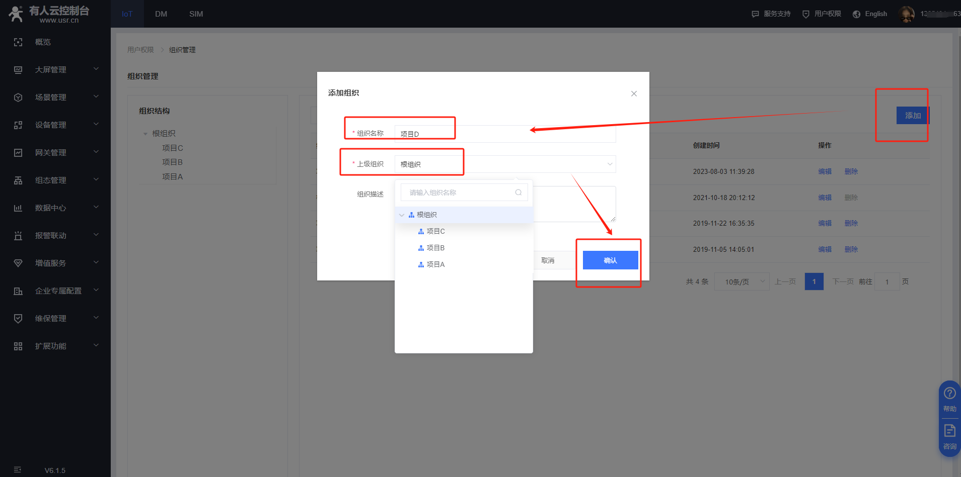 在iot平臺(tái)——用戶權(quán)限——組織管理,添加新組織,組織名稱可以自定義,上級(jí)組織選擇在在哪個(gè)組織下添加為新的組織,案例里上級(jí)組織是選擇的根組織,點(diǎn)擊確定,可以看到新添加的組織