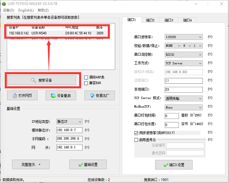 5、打開參數(shù)設(shè)置軟件USR-TCP232-M4,E45-V2.3.0.78.exe ,點(diǎn)擊“搜索設(shè)備”,點(diǎn)擊搜索到的模塊IP,選擇實(shí)際使用的端口 號(hào),此處以端口一,RS232串口舉例,配置參數(shù)如圖,點(diǎn)擊“端口1設(shè)置”