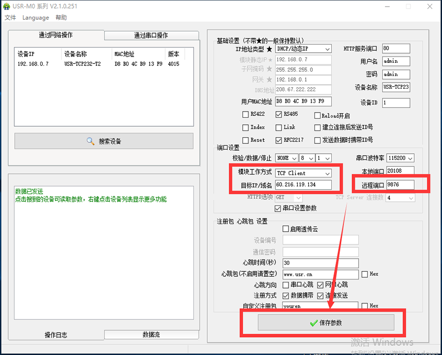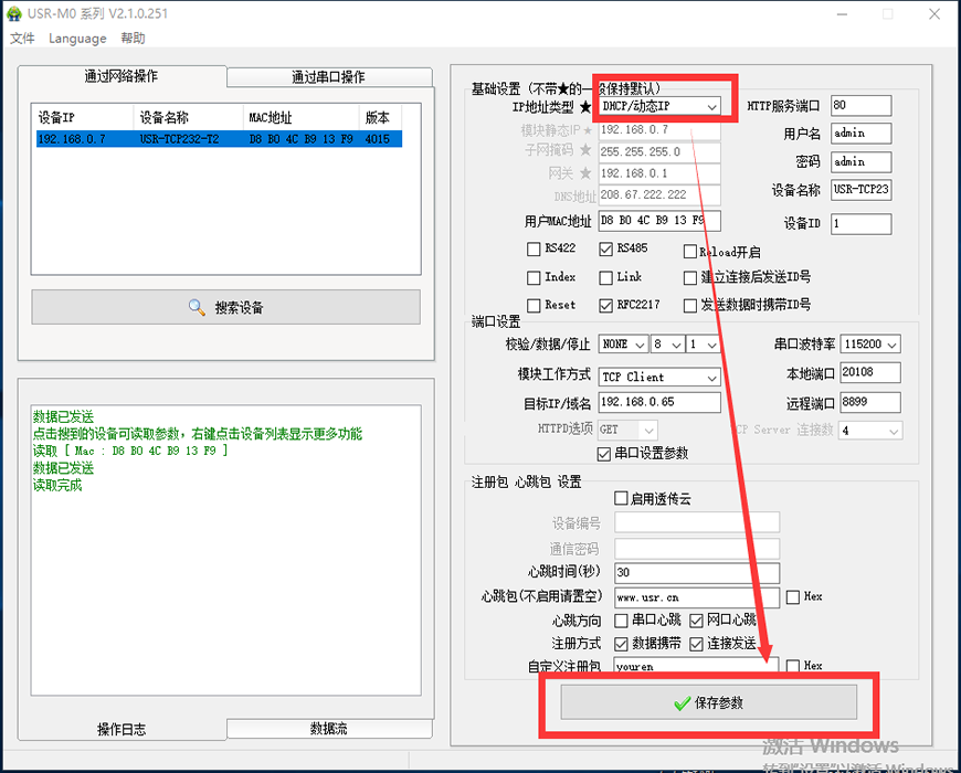 5、打開參數(shù)設(shè)置軟件USR-TCP232-M0-V2.1.0.251.exe ,點(diǎn)擊“搜索設(shè)備”,點(diǎn)擊搜索到的模塊IP,選擇是通過(guò)RS485串口還是RS232串口進(jìn)行通信,此處以RS232串口舉例,配置參數(shù)如圖,點(diǎn)擊“保存參數(shù)”
