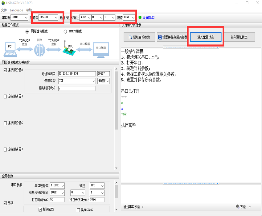 1、將USR-LTE-7S4模塊插入評(píng)估板,插入sim卡,串口連接電腦,打開參數(shù)設(shè)置軟件(下載地址http://lifj.com.cn/Download/415.html),模塊默認(rèn)串口參數(shù)是115200,N,8,1。點(diǎn)擊“進(jìn)入配置狀態(tài)”,如圖