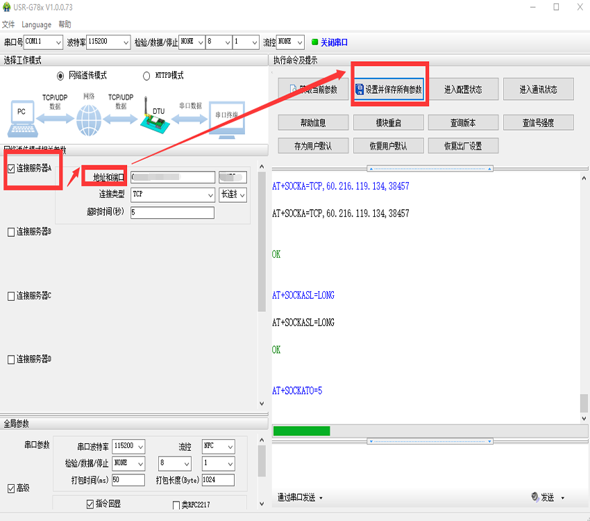 3、勾選連接服務(wù)器A,地址設(shè)置為公網(wǎng)服務(wù)器的公網(wǎng)IP,端口號(hào)為服務(wù)器上上位機(jī)軟件的端口號(hào)。點(diǎn)擊“設(shè)置并保存所有參數(shù)”,如圖