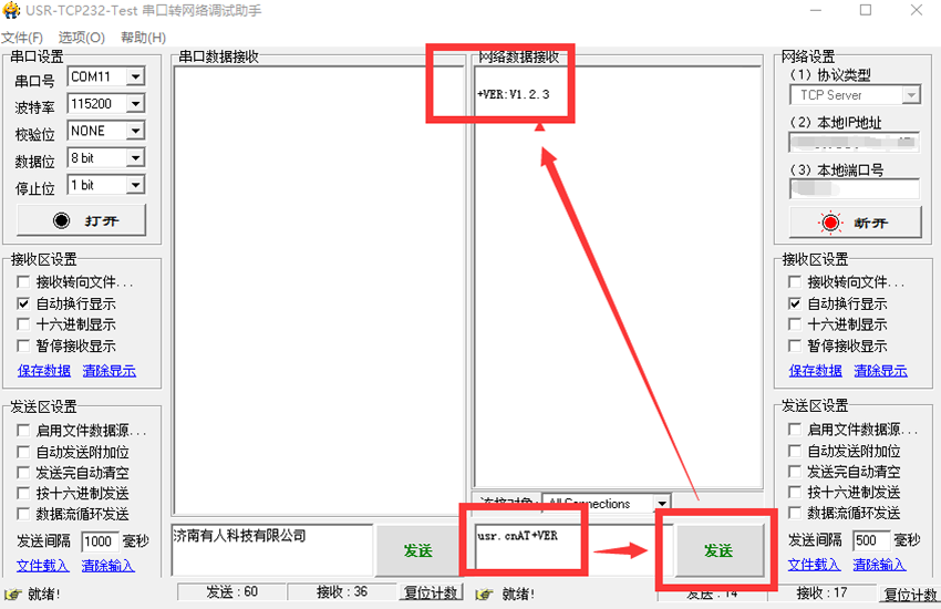 5、通過服務(wù)器端網(wǎng)絡(luò)調(diào)試助手發(fā)送帶有密碼(默認(rèn)是usr.cn)的AT指令可以實(shí)現(xiàn)網(wǎng)絡(luò)AT指令功能,如查詢模塊版本號(hào)可以發(fā)送:usr.cnAT+VER?跟回車,如圖