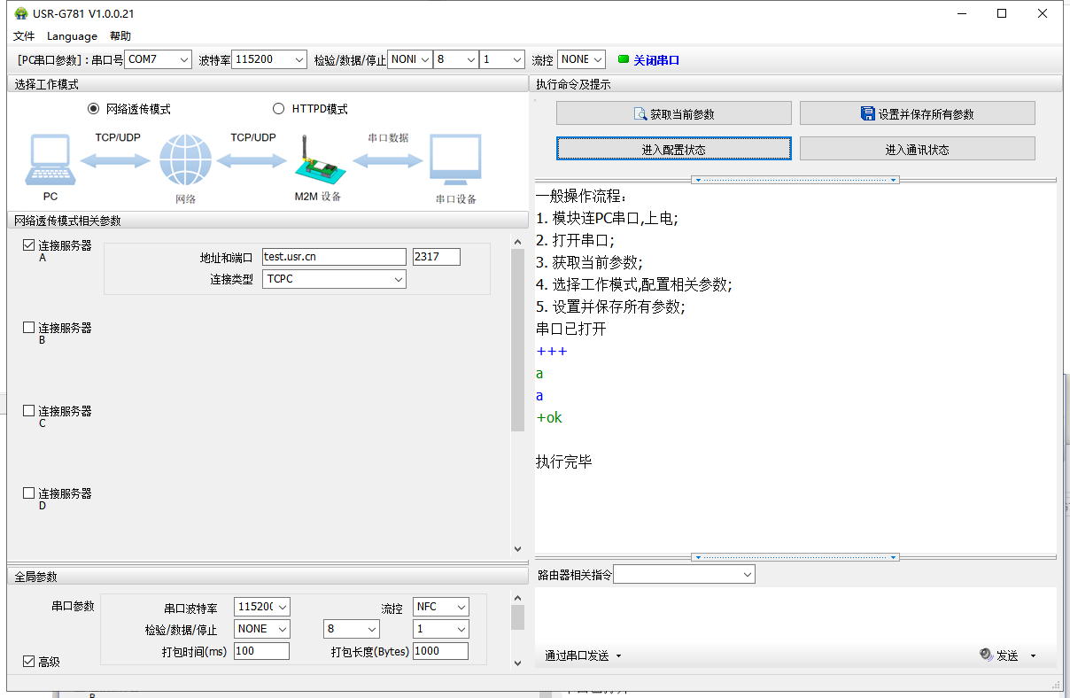 如下,打開串口,點擊進入配置狀態(tài),返回OK則表示成功進入配置狀態(tài)。