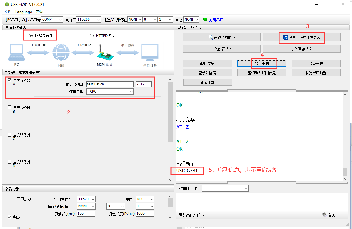 5>待重啟完畢后會在串口打印USR-G781字樣,表示設(shè)備啟動完成。設(shè)備上的linkA指示燈常亮,表示socketA建立連接