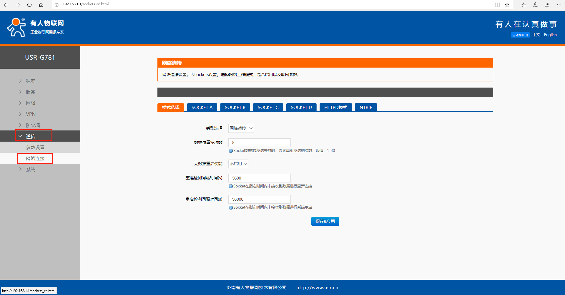 3. 在內(nèi)置網(wǎng)頁--透傳--網(wǎng)絡(luò)連接中設(shè)置參數(shù)