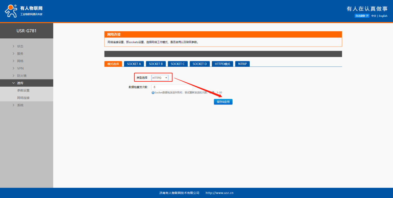 1>設(shè)置工作模式為HTTPD模式,保存并應(yīng)用。