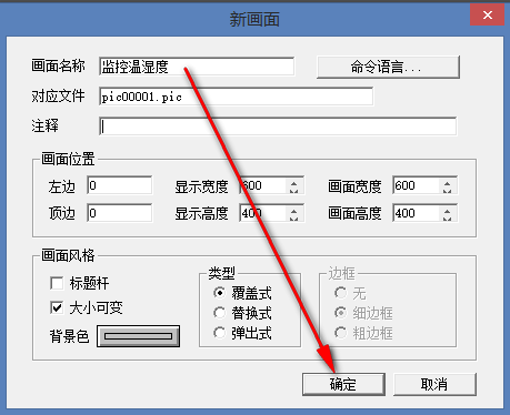 4.8 點擊“畫面”,新建一個畫面,畫面名為監(jiān)控溫濕度,點擊“確定”,進(jìn)入畫面編輯欄。