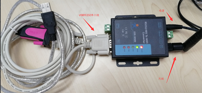 USR-W600(以下簡稱W600)接上供電電源,此時Power指示燈亮起;將W600的串口通過串口線(或者USB轉232)接到電腦上,裝上Wi-Fi天線,模塊正常啟動后,work指示燈常亮。