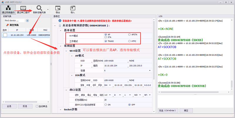 3> 打開設置軟件,選擇“通過網(wǎng)絡搜索”-->“刷新設備列表”,就能夠搜索到W600這個設備;可以在這個軟件中根據(jù)實際應用修改W600的各種參數(shù),這里我們只是做入門測試,就按照出廠默認的方式來測試。